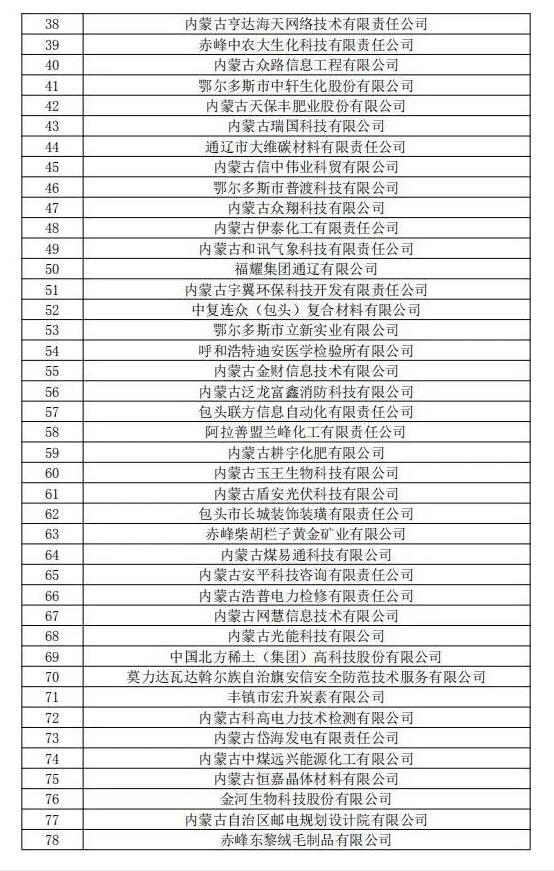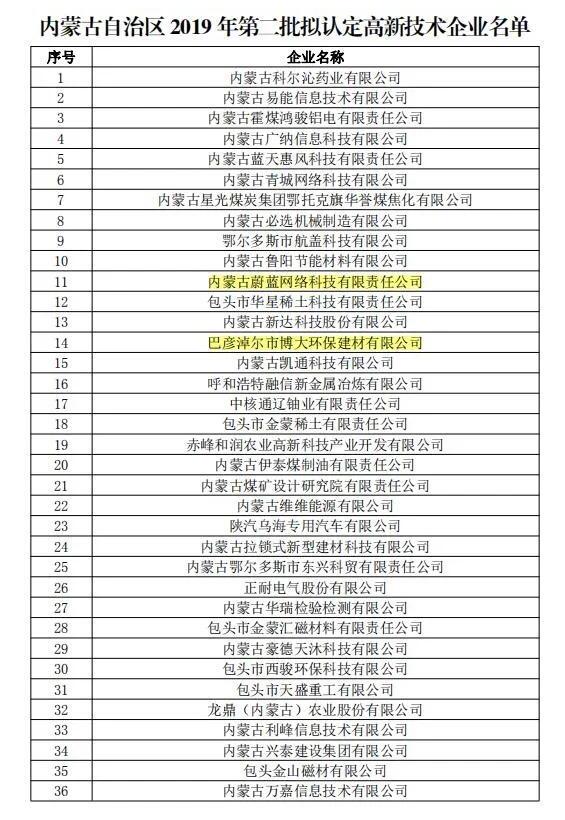 近日,全國高新技術企業(yè)認定管理工作領導小組辦公室分三批下達了內(nèi)蒙古自治區(qū)2019年高新技術企業(yè)備案名單,巴彥淖爾市草原晶鑫食品有限公司、蔚藍網(wǎng)絡科技有限責任公司、美洋洋食品有限公司等13家企業(yè)被新認定為我國高新技術企業(yè)。截至目前,全市共有高新技術企業(yè)51家。