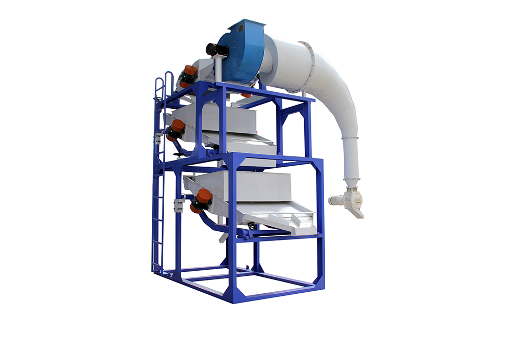除雜分選機(jī)主要用于葵花籽仁、南瓜籽仁等成品籽仁生產(chǎn)流水線的前端加工工藝,可以去除在上游設(shè)備加工過程中產(chǎn)生的破碎物料,使得成品整仁率更高,從而創(chuàng)造更高的產(chǎn)品價(jià)值。該設(shè)備由兩層篩體構(gòu)成,激振源采用雙振動(dòng)電機(jī),梯形篩片搭配魚鱗篩片以達(dá)到較好的選別效果,同時(shí)該機(jī)配有旋風(fēng)除塵器,可在一定程度上起到除雜效果。該產(chǎn)品結(jié)構(gòu)簡單,選別效果較好,是籽仁類產(chǎn)品加工生產(chǎn)線中的重要組成部分。